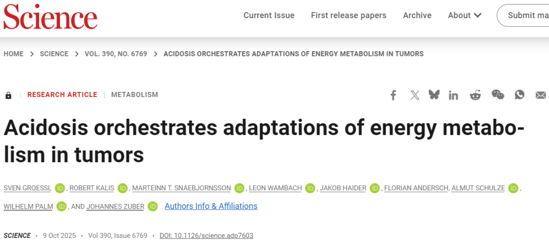 近期,德国癌症研究中心(DKFZ)与奥地利维也纳生物中心(VBC)的研究团队在《科学》(Science)杂志上发表了一项重磅成果:酸中毒被证实是肿瘤适应代谢压力的关键驱动力。