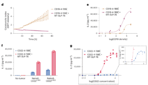 此次研究的关键创新在于引入 MT-SLP-76 —— 一种经设计的膜锚定信号分子。它将原本位于胞浆中的SLP-76直接锚定至细胞膜上,从而绕过ZAP-70招募受限的环节,即使缺乏LAT复合体,也能有效传导信号。研究显示,这一改造显著增强了CAR-T细胞的信号放大能力,使其能在抗原极低表达的情况下依然保持活性。