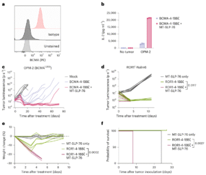体外实验中,MT-SLP-76与多种CAR结构(包括CD19、CD22、HER2和BCMA)共表达时均表现出卓越效能。例如,在仅有数百个CD19分子的Nalm6-CD19模型中,改造后的CAR-T细胞IL-2分泌和肿瘤杀伤活性显著提升,其抗原反应阈值从600至近25万分子/细胞均保持稳定。针对低抗原白血病模型,MT-SLP-76共表达的CD22 CAR-T不仅实现持续肿瘤清除,还显著提高了细胞扩增能力,而常规CAR-T仅能延缓病情进展。