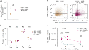在多发性骨髓瘤模型中,MT-SLP-76同样显著增强了BCMA CAR-T的抗肿瘤活性,使低BCMA表达细胞(1,200分子/细胞)也能被精准清除。进一步分析发现,该增强并未导致过度激活或T细胞耗竭,其中央记忆(TCM)与干细胞记忆(TSCM)比例与对照组相当,说明疗效提升的同时仍保持良好持久性。