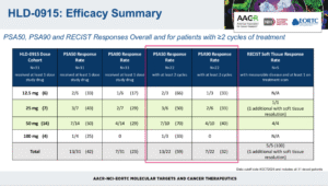 截至数据截止时,共有31例患者接受至少一剂治疗,其中13例(42%)达到PSA50缓解,7例(23%)达到PSA90缓解;在完成至少两个治疗周期的22例患者中,59%实现PSA50缓解,32%达到PSA90缓解。25 mg与50 mg剂量被确认为II期扩展试验推荐剂量。在10例接受50 mg HLD-0915治疗的患者中,70%达到PSA50缓解,40%达到PSA90缓解,所有5例可测量病灶患者均在首次反应评估中获得部分缓解(PR)。