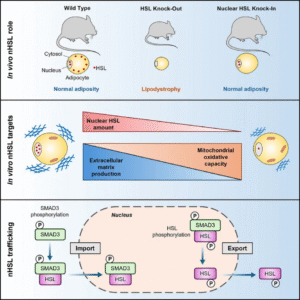在人类脂肪细胞的实验中,HSL即使失去酶活性,仍能通过调节线粒体氧化磷酸化与细胞外基质功能,参与脂肪组织能量平衡的双向调控。研究者将其称为一种“代谢开关”,能够在细胞核层面上协调能量稳态。