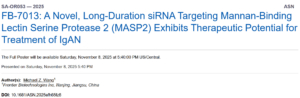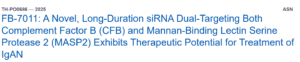 在 2025 年 ASN Kidney Week 期间,我国学者 Michael Z. Wang 报道了 FB-7013 的研发进展。FB-7013 是一种 GalNAc 偶联小干扰 RNA(siRNA),靶向 LP 关键蛋白酶 MASP2,可在 IgA 肾病进程中精确抑制 LP 激活。