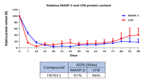 - 对食蟹猴(n = 3)单次皮下注射 6 mg/kg 剂量的 FB7011,每周采集血样并通过 ELISA 法(MASP-2 蛋白)和 Western Blot 法(CFB 蛋白)对靶蛋白进行定量分析。结果显示,FB7011 可持续显著抑制靶蛋白表达,对 MASP-2 和 CFB 的最大敲低率分别达 97% 和 96%,且药效持续超过 70 天未出现反弹迹象。