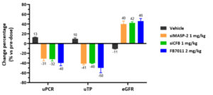 - 在治疗后第 8 周,与 siMASP-2(1 mg/kg)和 siCFB(1 mg/kg)相比,FB7011(2 mg/kg)的 uPCR 降幅分别多出约 29% 和 25%,eGFR 升幅分别高约 15% 和 10%,uTP 降幅分别大 22% 和 25%(图 d)