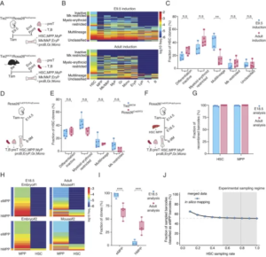 研究团队开发了可在数月尺度内追踪单个血细胞命运的遗传标记体系,对小鼠体内血细胞来源进行系统分析。结果显示,约三分之一的血细胞来自 eMPPs 系统,并且两套造血系统在功能上存在清晰分工: