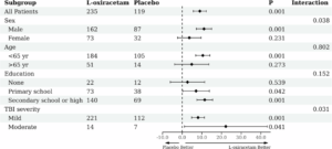 在具体认知维度分析中,L-oxiracetam 在视觉感知、空间感知、运动实践、视觉-运动组织、思维操作以及注意力与集中力等多个领域的改善均显著优于安慰剂组,体现了其对认知功能的广谱提升作用。亚组分析进一步发现,男性患者及中度 TBI 患者从 L-oxiracetam 治疗中获益更为明显,为未来分层治疗和精准用药提供了重要依据。
