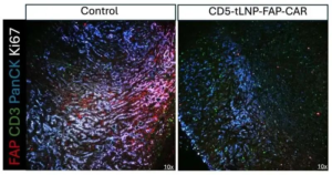 在实体瘤治疗领域,CAR-T细胞疗法正面临肿瘤微环境抑制、T细胞浸润不足等关键挑战。生物医药管线CGT合作大会关注到,近期一项创新性研究通过开发靶向CD5的脂质纳米颗粒,实现了静脉注射后体内原位生成靶向成纤维激活蛋白(FAP)的CAR-T细胞,在胰腺癌模型中展现出显著的治疗效果,并为重塑免疫抑制性肿瘤微环境提供了新的策略。