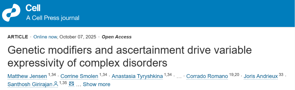 美国宾夕法尼亚州立大学 Santhosh Girirajan 课题组在《细胞》(Cell)上发表的重磅研究论文Genetic modifiers and ascertainment drive variable expressivity of complex disorders。